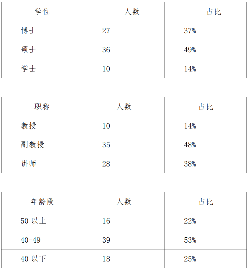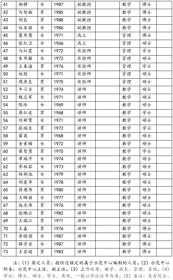 截止目前,示范中心共有教师73名,其中高级职称45名,占比61%。博士27名,占比37% 。
