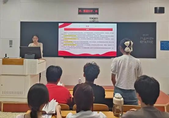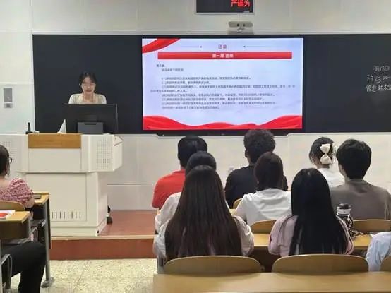 在本次团课活动中,周慧鋆向各位同学详细介绍了共青团的艰辛发展史以及成长历程中光辉的奋斗史,讲解团旗、团徽、团歌等与团相关的知识。台下的同学们紧跟课程讲解,并积极回答问题。