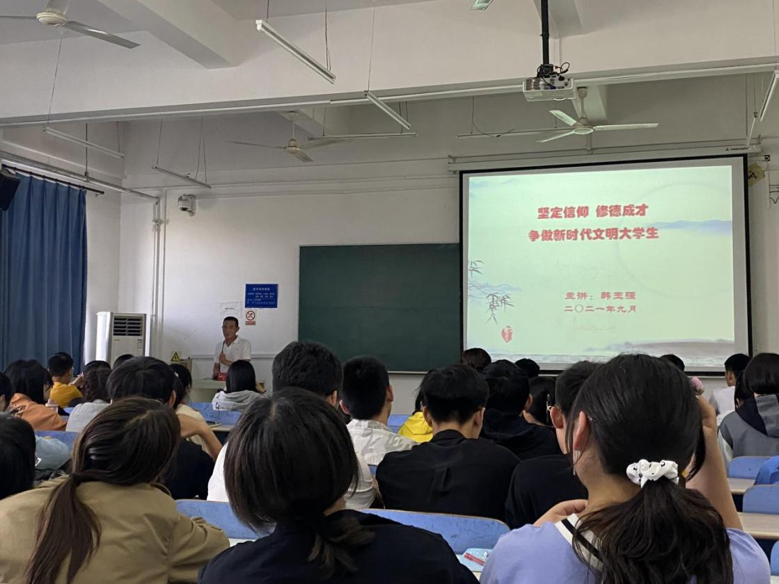 副书记韩玉强以“坚定信仰、修德成才、争做新时代文明大学生”为主题,对新生进行理想信念教育。