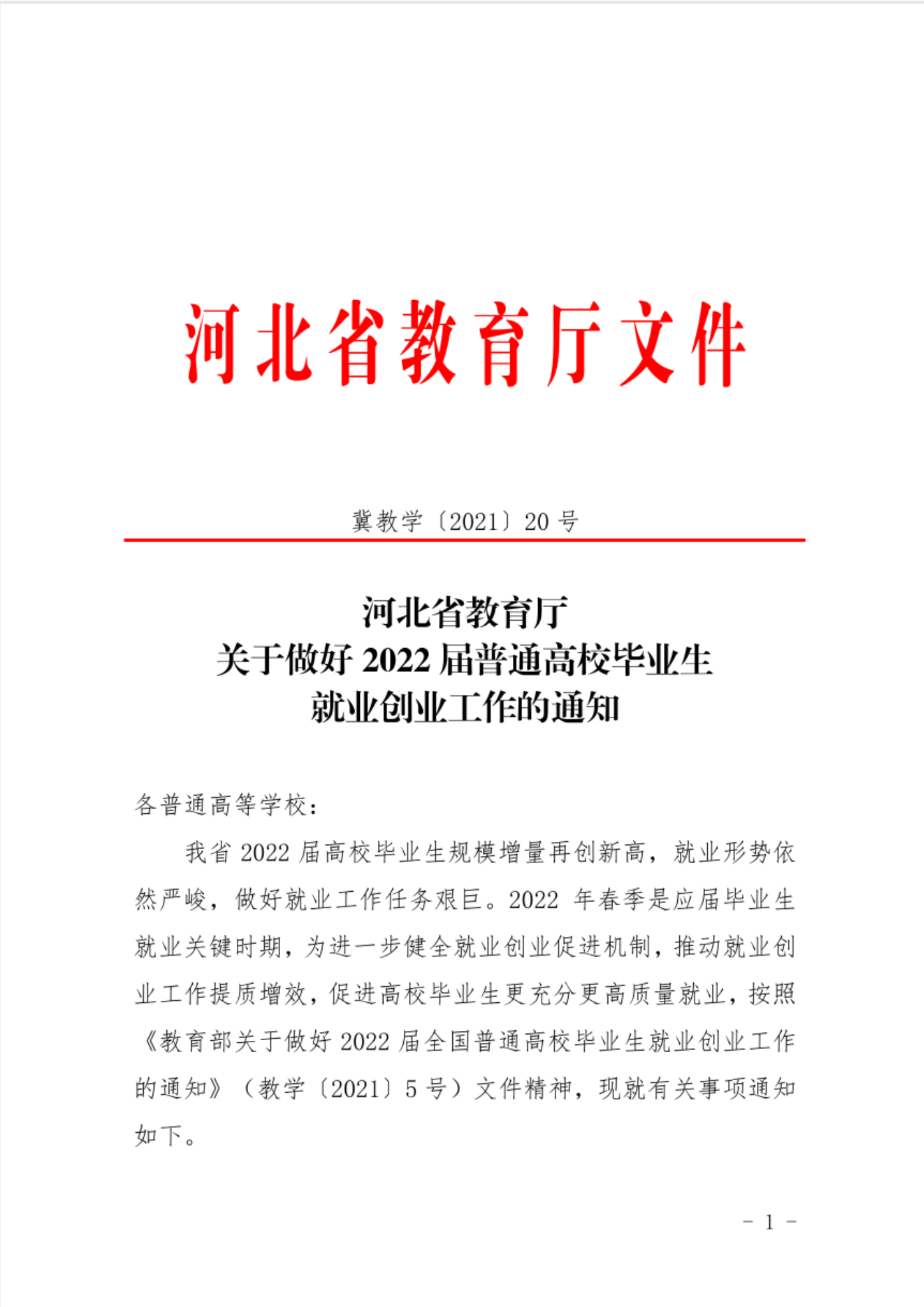 河北省教育厅关于做好2022届普通高校毕业生就业创业工作的通知