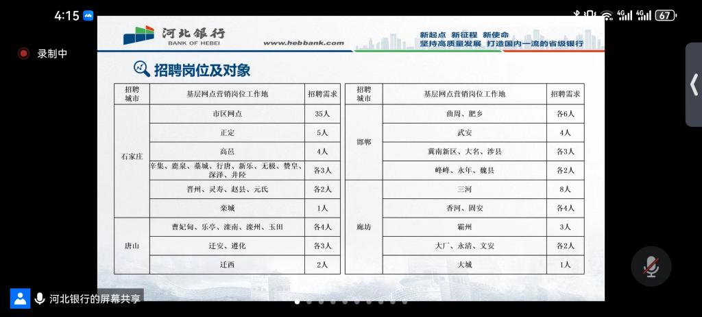 宣讲会上,徐老师对本公司的具体情况以及企业招募要求进行了详细讲解,并针对同学们的问题作出针对性解答。此外,徐老师就河北银行的发展历程和未来前景进行了讲解,并详细介绍了公司的员工福利和待遇。随后负责人就银行相关行业的就业需求进行了解读,诚挚邀请各位同学踊跃报名。
